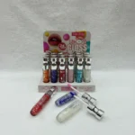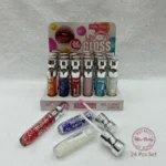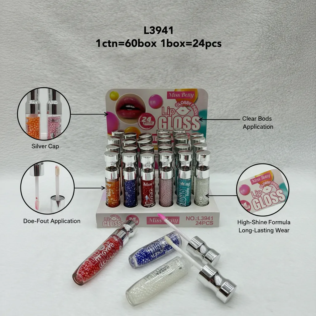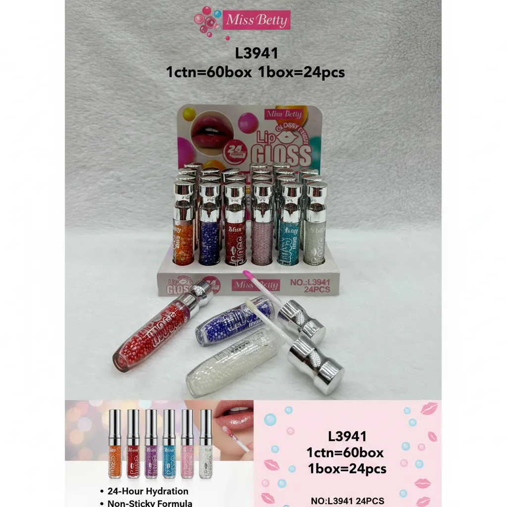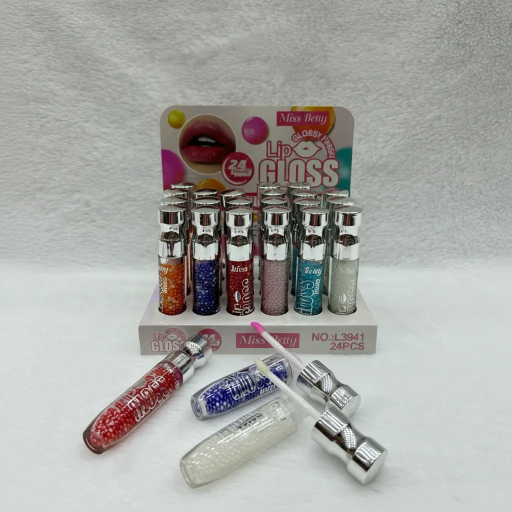 The Miss Betty Lip Gloss Set (Model L3941) offers a vibrant collection of 24 lip glosses, each featuring a unique glossy finish. The formula is designed for long-lasting wear and a high-shine look. The clear bottles are uniquely filled with colorful beads, adding a stylish aesthetic to the product. This set is packaged in a professional display box, making it ideal for retail stores or makeup enthusiasts looking for a variety of shades.